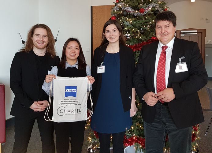 Prof. Aldo R. Boccaccini war Gastredner am 8. Symposium der Berlin-Brandenburgischen Schule für Regenerative Therapien (BSRT), das vom 29. November bis 1. Dezember 2017 in Berlin stattfand. Das Symposium widmete sich einem Superhelden-Thema, um Wissenschaftler unter dem Motto: Erwachen von ANERKENNUNG, REPARATUR, WACHSTUM und PERSONALISIERTER BIOMEDIZIN zu vereinen. Im Rahmen dieses Themas war Boccaccini Iron Man und hielt dabei den Vortrag "Biomaterialien zur Unterstützung der Regeneration". Unser Institut wurde auch vertreten durch Lukas Gritsch, Agata Lapa und Binh Phan (im Bild bei Prof. Boccaccini), die Ergebnisse ihrer Promotionsprojekte im Rahmen des von EU Horizon 2020 geförderten ETN-Projekts HyMedPoly ("Medikamenten freie antibakterielle Hybrid-Biopolymere für medizinische Anwendungen") vorstellten. Im Bild ist auch Dr. Taimoor Qazi zu sehen, ein ehemaliger Masterstudent unseres Instituts, der derzeit an der Charite Berlin arbeitet. -