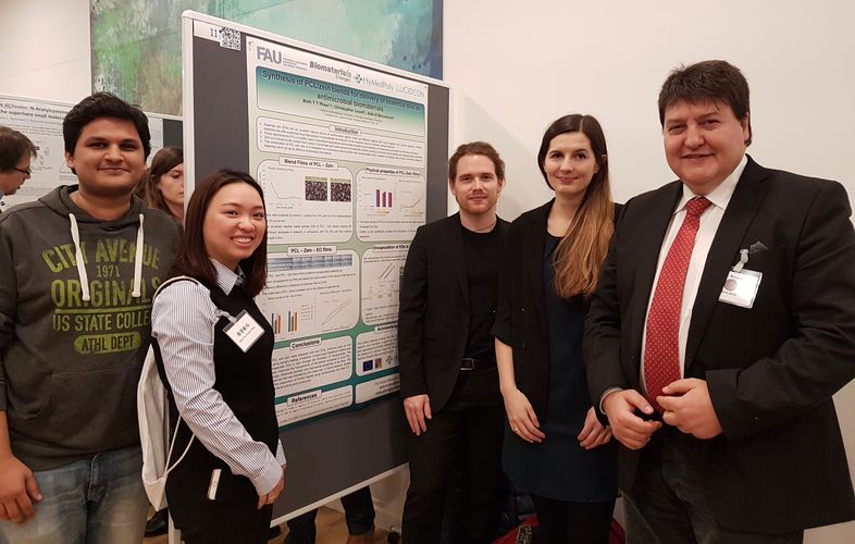 Unser Lehrstuhl war beim Jahrestreffen der Deutschen Gesellschaft für Biomaterialien (DGBM) in Würzburg von 9.-11. November 2017 herausragend vertreten. Prof. Boccaccini präsentierte den Vortrag lecture "Bioactive glasses as ideal biomaterial vehicles for biologically active ion release in tissue engineering and wound healing applications" in der Sondersitzung "Gläser – Ein innovatives Biomaterial", welche er mit Dr. M. Kilo (Fraunhofer ISC, Würzburg) moderierte. Prof. Boccaccini betonte, dass dies die erste Sitzung in der Geschichte der DGBM war, die einzig und allein für bioaktiver Gläser zur Verfügung stand. Prof. Boccaccini moderierte auch die Sitzung „New Strategies in Biomatierals I" zusammen mit Prof. U. Gbureck (Universität Würzburg). Dr. Rainer Detsch und Dr. Aldo Leal-Egana präsentierten jeweils die Vorträge "Electrical conductive hydrogel bioink composed of Alginate di-aldehyde gelatin (ADA-GEL) and Polypyrrole (PPy)" und "Determining the metastatic potential of cancer cells in vitro: the relevance of performing dynamic single-cell analysis on soft patterned hydrogels ". Folgende Doktoranden nahmen an der Konferenz teil und präsentierten Poster: Vera Bednarzig, Francesca Ciraldo, Qaisar Nawaz, Lena Vogt und Dirk Dippold (Doktorand am Lehrstuhl für Polymermaterialien, FAU). Dr. Raminder Singh von der Nanomedizin, Universitätsklinik Erlangen, der mit unseren Lehrstuhl im Bereich von magnetischen Zellbesiedelungstechniken zusammenarbeitet, präsentierte auch ein Poster (abgebildet mit Prof. A. R. Boccaccini). - Treffen des H2020 EU Projekts "MOZART" in Erlangen