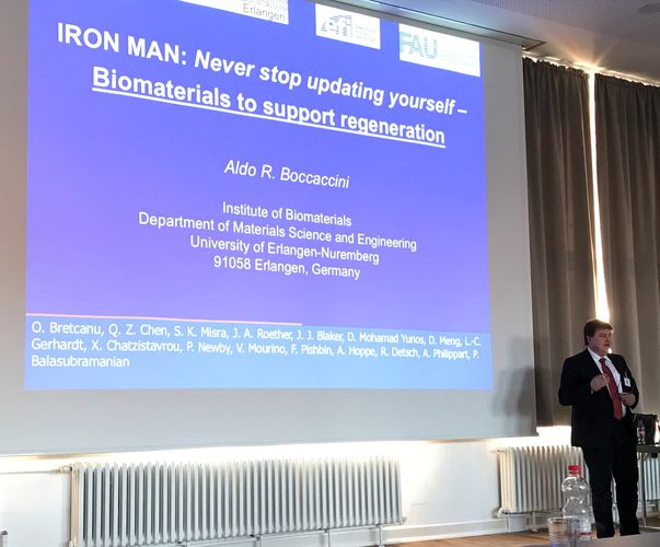 Der 7. internationale Workshop des European Virtual Institute on Knowledge‐Based Multifunctional Materials (KMM‐VIN AISBL) "Biomaterials: Key Technologies for Better Healthcare" fand vom 27. bis 28. September 2017 in Erlangen (Deutschland) statt. Der Workshop wurde von Prof. Aldo R. Boccaccini (Lehrstuhl Biomaterialien, FAU) als auch von Prof. Stefan Sesselmann (InnoPlant/Medical Valley Centre) und Prof. Heike Walles (Universität Würzburg) geleitet. Der Workshop brachte Experten aus Industrie und Forschung zusammen, die in dem breit gesteckten Bereich der biomedizinischen Materialien arbeiten. Die Themen umfassten das Design, die Herstellung, Charakterisierung und die Anwendungen einer Vielzahl von Biomaterialien. Das Programm enthielt eine Kombination aus Hauptvorträgen, Vorträgen und Posterpräsentationen und lockte ein großes Publikum von Forschern aus Industrie und Forschung. Auf einem der Bilder sind die Hauptreferenten Prof. C. Hellmich (TU Wien), Prof. R. Horch (Universitätsklinikum Erlangen), Prof. H. Walles (Universität Würzburg, Ko-Vorsitzende), Prof. S. Jockenhövel (RWTH Aachen) mit Prof. Boccaccini zu sehen. (Zum Vergrößern, Bilder anklicken)